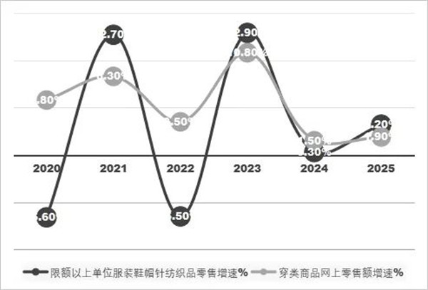 2020-2025年限额以上单位服装鞋帽针纺织品零售增速与穿类商品网上零售增速