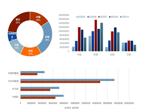 从左至右分别为:欧盟进口区外毛纺产品地区进口额份额;2024-2025年1-10月欧盟进口主要毛纺产品进口额情况(单位:欧元)