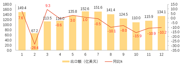 1-12月,针织服装出口698.8亿美元,同比下降4.3%;出口数量244.2亿件,增长3.9%。梭织服装出口615.2亿美元,同比下降5.6%;出口数量145.3亿件,增长3.7%。衣着附件出口150.3亿美元,同比下降4.2%。