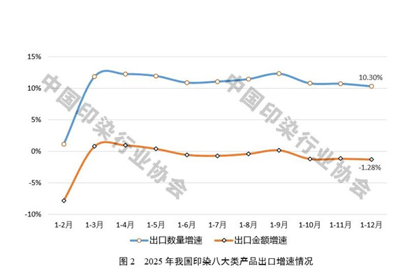 2025年,全球经济增长放缓,国内外市场需求不足,美国关税政策对我国纺织品服装出口造成冲击,我国印染行业出口明显承压。但当前我国印染行业仍具有明显的国际竞争优势,为全球纺织服装生产流通提供了坚实支撑,2025年我国印染八大类产品出口数量再创历史新高,“十四五”期间出口数量累计涨幅达到59.97%,行业出口保持韧性。值得注意的是,全年出口金额增速明显低于出口数量增速,主要印染产品出口平均单价呈现下降态势,目前已降至2007年以来最低水平,关税政策扰动叠加市场需求不足,导致出口竞争进一步加剧。