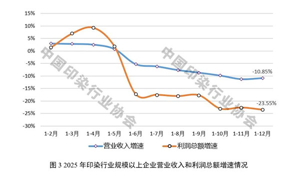 2025年,受终端需求偏弱、出口竞争加剧等因素影响,印染企业生产经营压力明显上升,运行质效持续下滑。根据国家统计局数据,2025年1~12月,规模以上印染企业营业收入同比下降10.85%,降幅较前三季度加深2.14个百分点;利润总额同比下降23.55%,降幅较前三季度加深5.79个百分点;成本费用利润率5.03%,同比降低0.84个百分点;营业收入利润率4.64%,同比降低0.77个百分点。行业亏损情况进一步加深,1869家规模以上企业亏损户数为616户,亏损面32.96%,同比扩大3.03个百分点;亏损企业亏损总额36.47亿元,同比增长19.96%。2025年以来,纺织产业链各环节经济运行均有所承压,与纺织全行业相比,印染行业主要经济效益指标降幅更为明显,全年印染行业营业收入、利润总额降幅分别高于纺织全行业2.62和7.43个百分点,亏损面高于纺织全行业10.32个百分点。