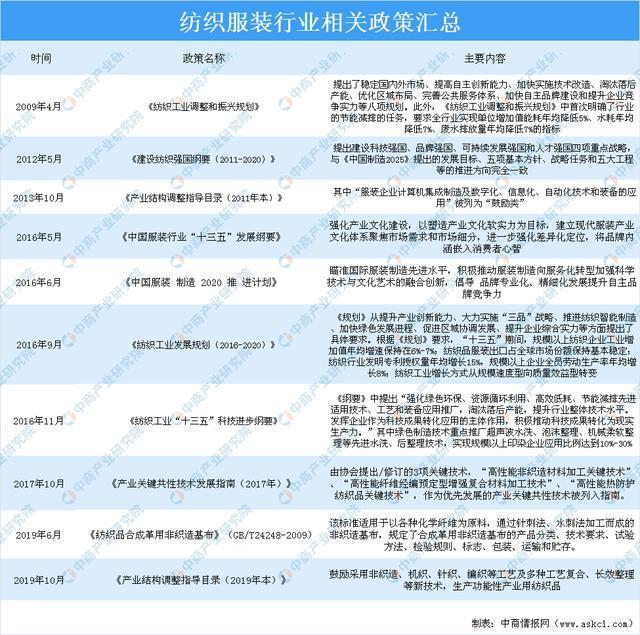 近年来,国家及相关部门出台了一系列支持纺织服装行业发展的政策法规。各项产业政策的实施为行业发展奠定了良好的政策环境,从产业的发展目标,增长速度,行业规范、重点发展方向及技术手段和下游重点应用领域等方面作出明确的指导,有利于促进整体行业健康快速发展。