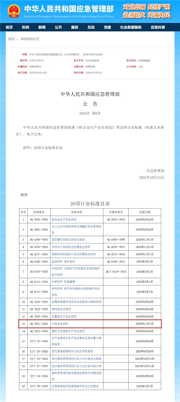 为推动印染企业强化安全管理,提升安全保障能力,应急管理部组织制定了强制性行业标准《印染安全规范》(AQ 7021-2025),并于近期正式发布。