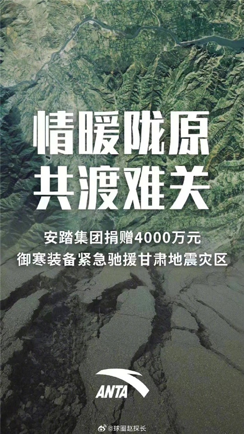 安踏集团捐赠4000万元御寒保暖装备紧急驰援甘肃地震灾区。