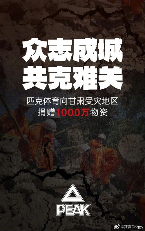 匹克体育向甘肃受灾地区捐增1000万元物资。