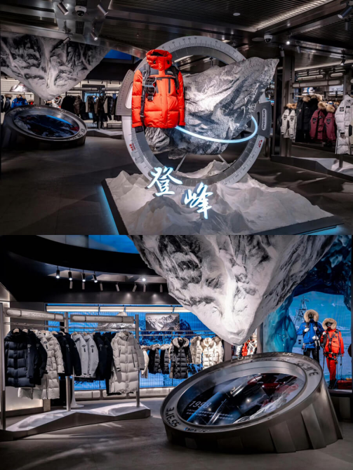 整个店铺构造分为两层,一层以“顶峰相见”为主题,划分为启程、顶峰、征途、归来四个部分。以珠峰场景为设计灵感,象征着的攀顶的至高精神和中国人血脉中的坚定信念,寓意波司登对更高维度的不懈追求,诠释品牌的登峰基因。二层则以“无限可能”为主题,通过南北极地冰川、极光的场景打造,呈现征服极地场景空间,挑战边界之外的能量,寓意波司登从登峰造极走向无限可能,带来一场视觉与心灵的双重盛宴。